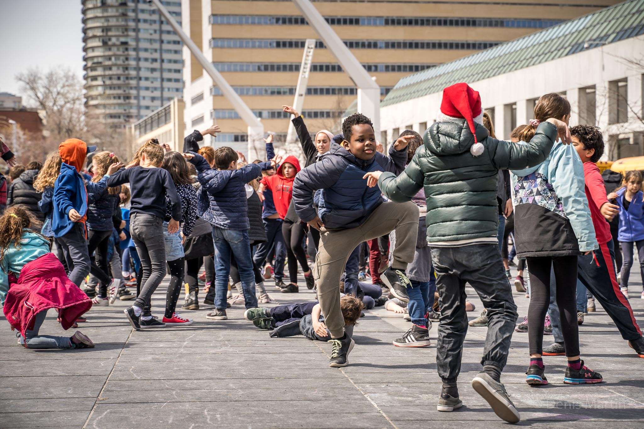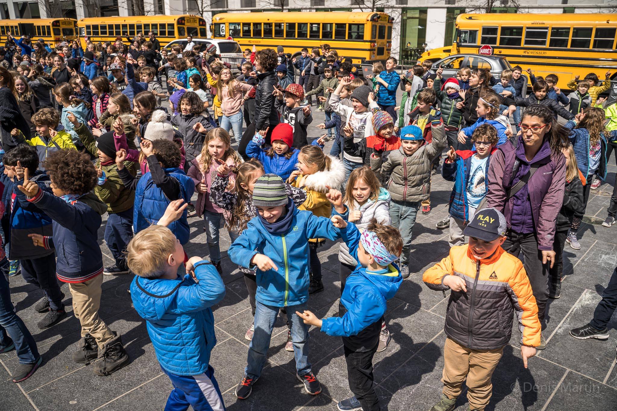 The choreography was performed at Place des Festivals (Quartier des spectacles in Montreal) by the children to the song Let’s Go Out, an original creation by singer-songwriter Dumas. The activity is the result of more than 125 school workshops on initiation and creation in contemporary jig, body percussion, and contemporary dance.